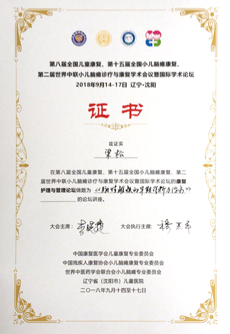 2018年9月14日至17日,由中国康复医学会儿童康复专业委员会、中国残疾人康复协会小儿脑瘫康复专业委员会、世界中医药联合会小儿脑瘫专业委员会主办的“第八届全国儿童康复、第十五届全国小儿脑瘫康复、第二届世界中联小儿脑瘫诊疗与康复学术议暨国际学术论坛”在辽宁省沈阳市隆重召开。