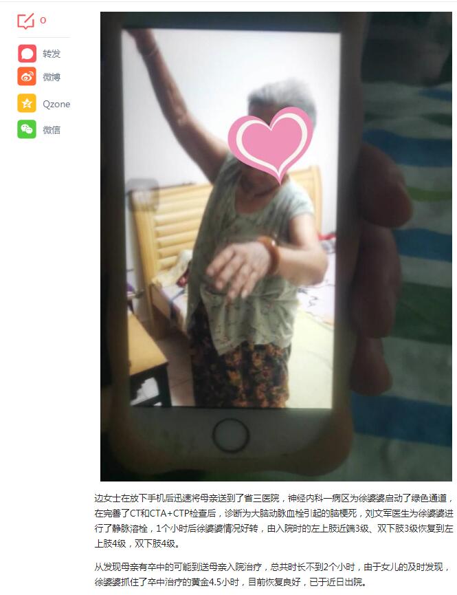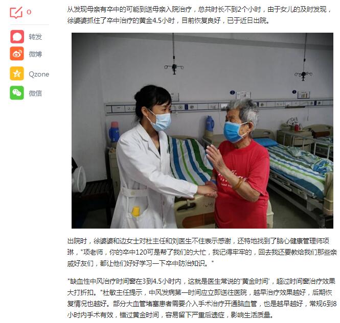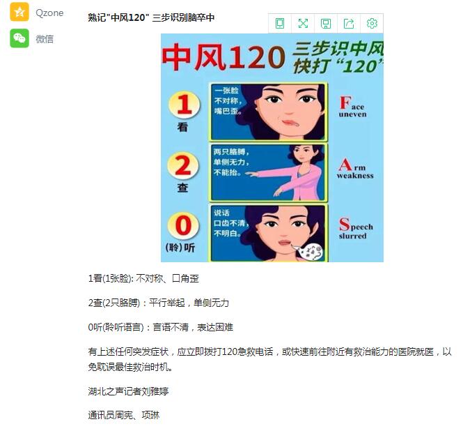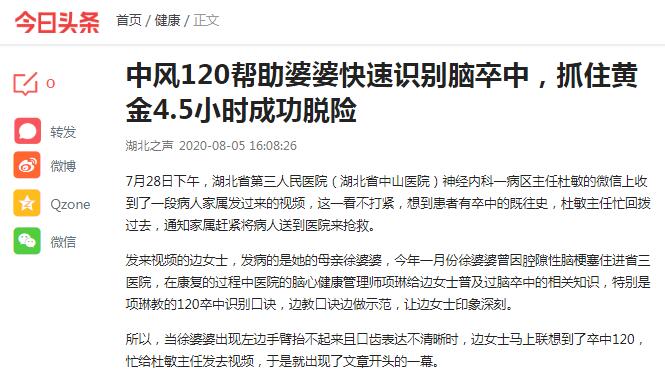 中风120帮助婆婆快速识别脑卒中,抓住黄金4.5小时成功脱险 发布时间:2020-08-07 来源:转载自今日头条 上一篇:发作性眩晕的罪魁祸首——良性阵发性位置性眩晕(耳石症) 下一篇:【卒中课堂】天旋地转,一动就晕,原来是“石头”在惹祸!