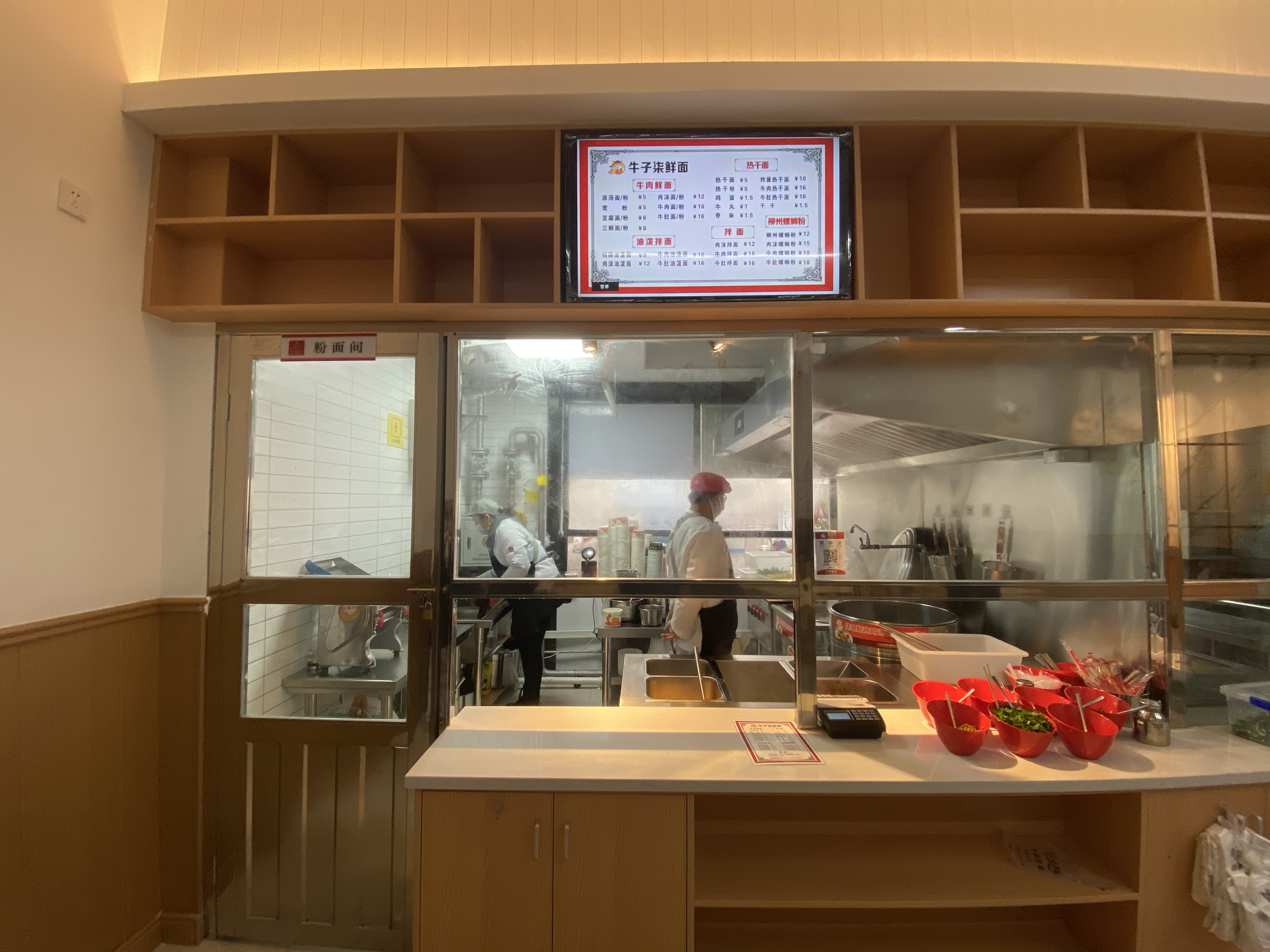 新食堂一层设有小碗菜、盖饭档口,同时新增特色粉面档口,冬天的早上来一碗热腾腾的面条,最适合不过了。