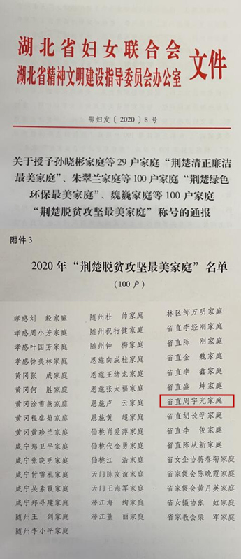 近日,省妇联、省文明办公布2020年“荆楚最美家庭”名单,湖北省第三人民医院(湖北省中山医院)周宇光家庭获2020年“荆楚脱贫攻坚最美家庭”称号。