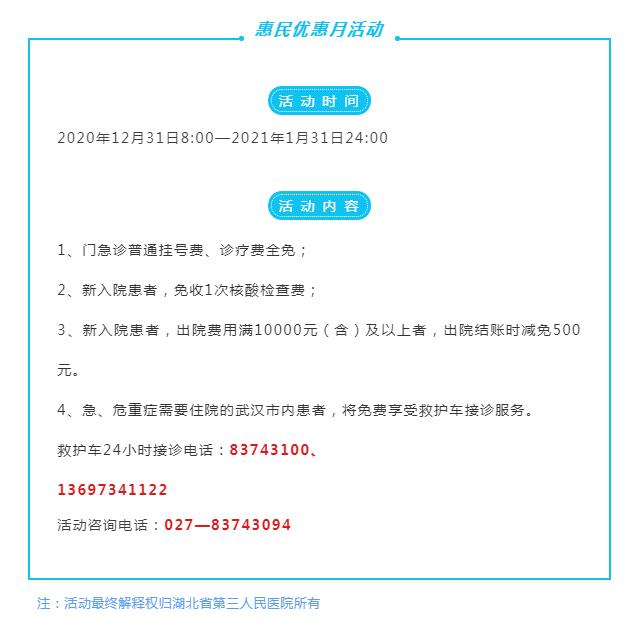 据悉,自2020年12月31日湖北省第三人民医院惠民优惠月活动开展以来,前来看病的患者络绎不绝,截止1月10日,湖北省第三人民医院已提供免费核酸350多人次,门急诊免挂号、诊疗费达10000多人次。