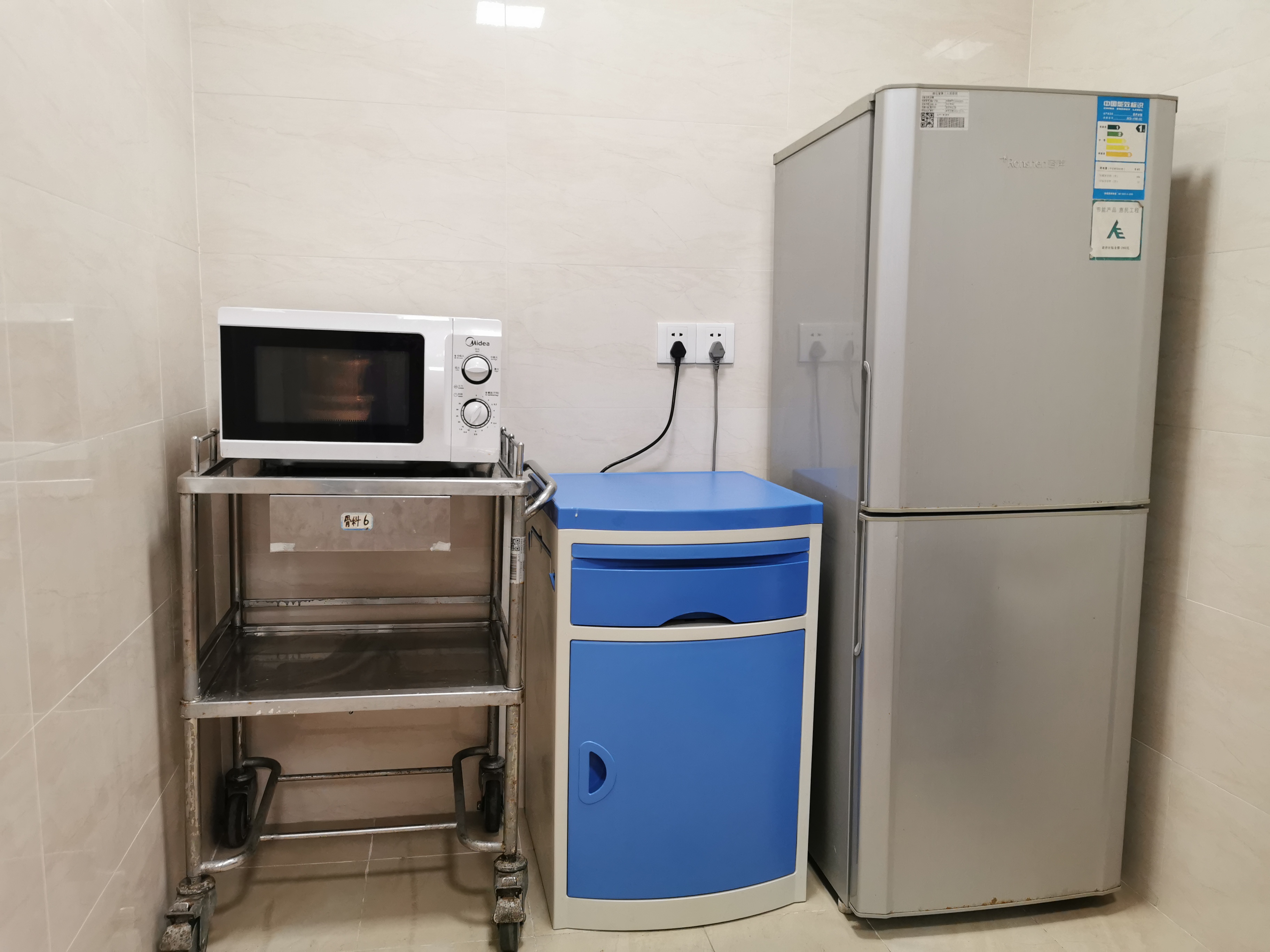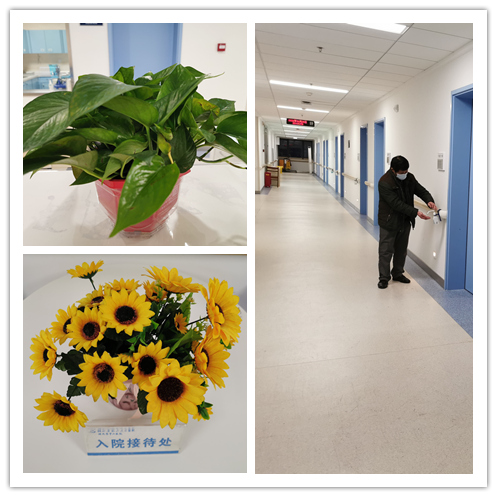病区配餐间放置有电冰箱、开水器及微波炉,护士站也增设了一台微波炉,缩短了就餐高峰期的热饭时间。病区内还特别设置了晾晒区,满足患者日常洗晒衣物的需求。