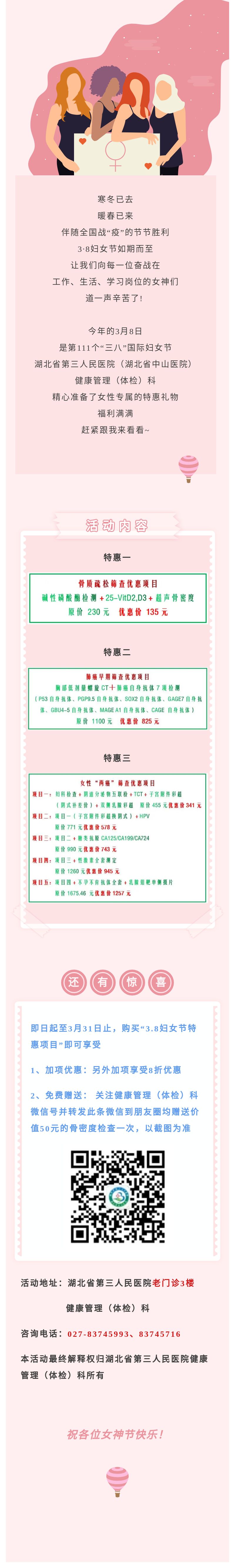 【活动】“三八妇女节”福利来袭,赶紧点开看看! 发布时间:2021-03-03 来源:健康管理(体检)科 上一篇:弘扬雷锋精神 践行社会服务 ——我院开展义诊进华园社区志愿服务活动 下一篇:【活动】省三医新楼正式启用,福利优惠送不停