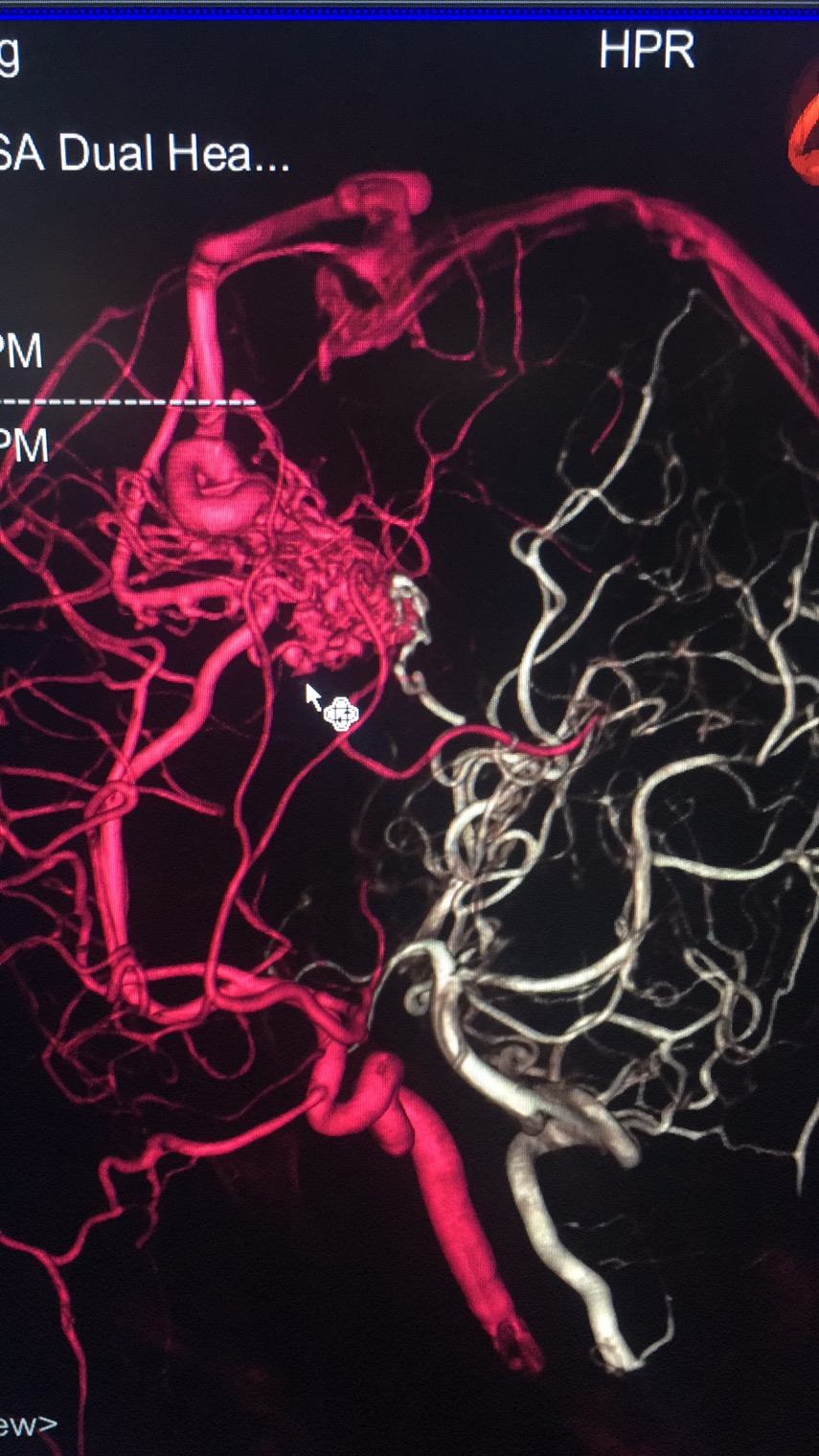 第二位患者是从外省转来的15岁少女小李,半月前突发脑出血,在当地医院行微创钻孔引流手术,后期通过CTA发现有脑动静脉畸形。