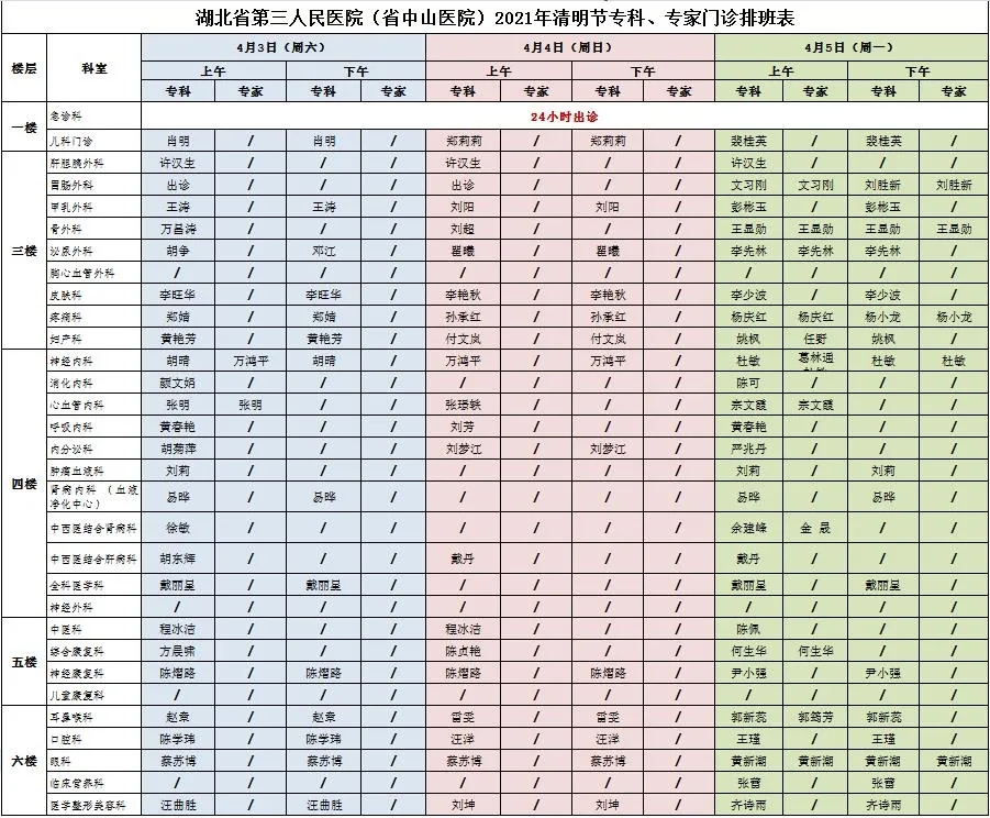 【通知】湖北省第三人民医院清明节门诊安排 发布时间:2021-04-02 来源:门诊办公室 清明节放假期间(2021年4月3日-5日),急诊24小时应诊,专科门诊以当日安排为准;超声、放射、检验等医技科室24小时值班。 咨询电话:027-83745674,83745675 上一篇:星星之火 燎原我省脑心健康管理事业蓬勃的春天 ——湖北省脑心健康管理师培训基地第一期培训班圆满闭幕 下一篇:清明时节,养肝正当时