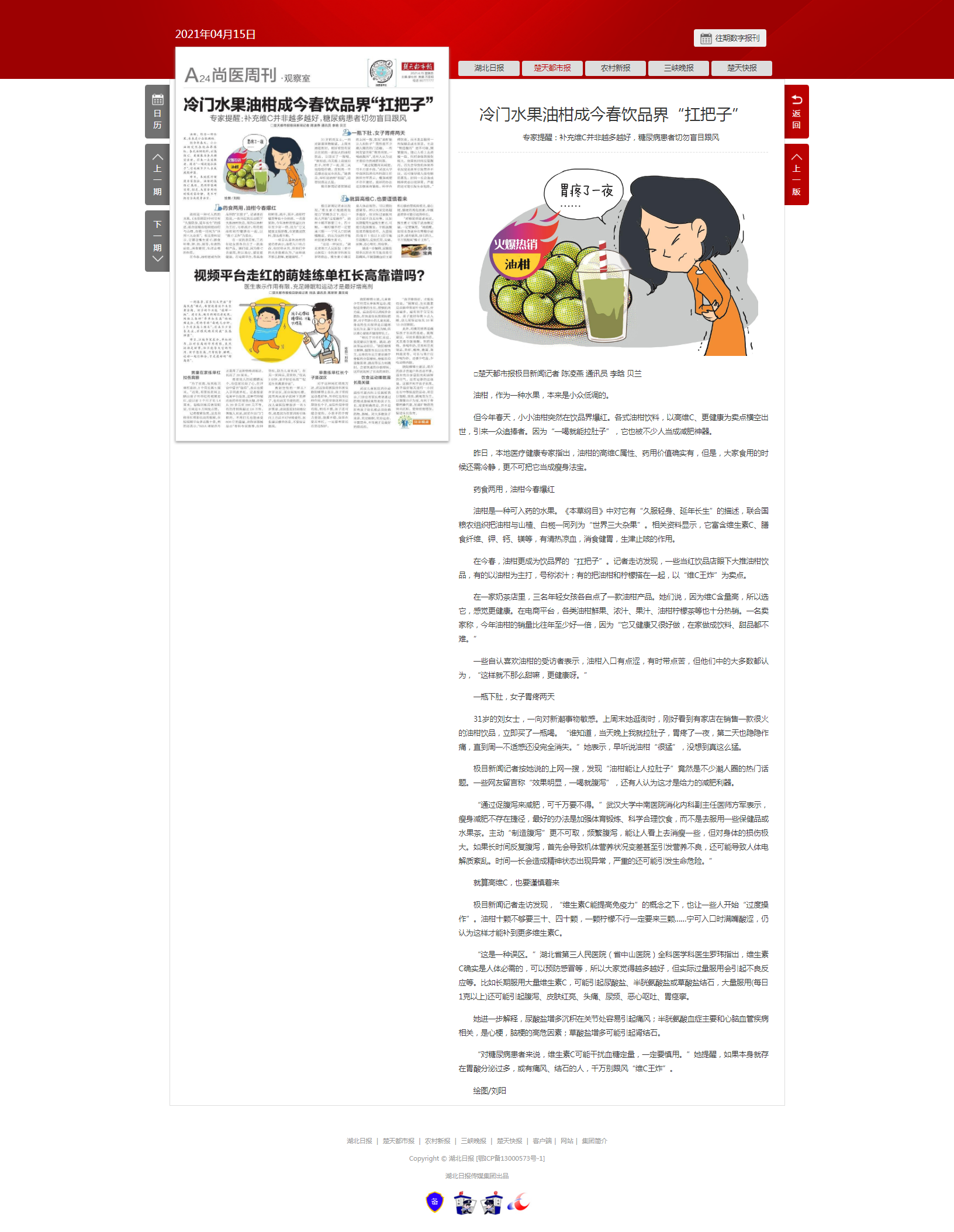 【楚天都市报】冷门水果油柑成今春饮品界“扛把子” 专家提醒:补充维C并非越多越好,糖尿病患者切勿盲目跟风 发布时间:2021-04-21 来源:转载自楚天都市报 上一篇:【楚天都市报】航母级手术室入住省第三人民医院 下一篇:【武汉晚报】双手总是湿哒哒 巧施“魔法”变干燥 妙龄少女告别“水手”生活