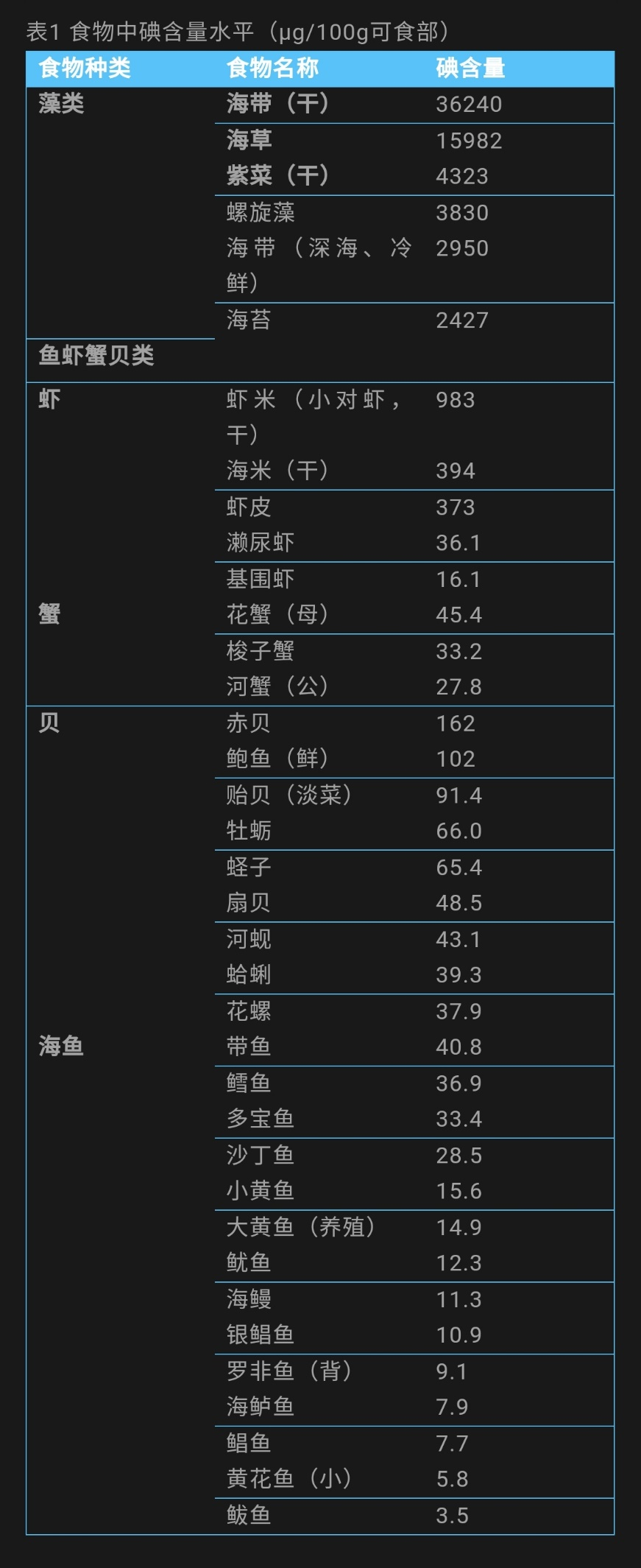 人体自身不能生产碘元素,机体碘的摄入80%来源于食物与饮用水。食物中海藻类如海带、紫菜的含碘量是最高的。
