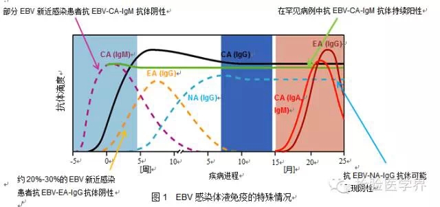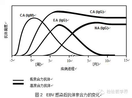 原发性EB病毒感染过程中首先产生针对衣壳抗原的IgM和IgG抗体,在急性感染的晚期,针对早期抗原的IgG抗体出现;在恢复期的晚期,针对核抗原抗体产生。抗EBV-CA-IgG抗体和抗EBV-NA-IgG抗体可持续终身。因此,根据EBV感染期间产生抗体的不同动力学特点,同时检测患者血清中上述4种抗体可以初步判断感染时相。