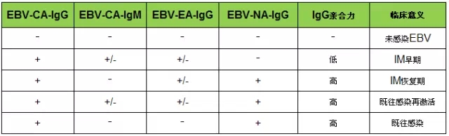 有研究表明,部分EBV相关性IM病例在临床症状期间抗EBV-CA-IgM抗体阴性,抗EBV-CA-IgG低亲合力抗体的检测可以提高EBV相关性IM诊断的敏感性。抗EBV-CA-IgG抗体亲合力检测能够有效区分新近感染与既往感染,为EBV相关性IM的诊断提供强有力的补充依据。