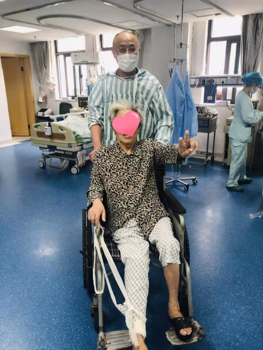 端午节前夕,湖北省第三人民医院(省中山医院)重症医学科的医护人员为一对患者母子拍下一张难忘的合影。照片里,88岁的患者李婆婆(化名)坐在轮椅上,面对镜头开心的做出“胜利”的手势,脸上露出灿烂的笑容,而她年过六旬的儿子推着轮椅,虽然戴着口罩,但仍然能从双眼里看到满满的喜悦之情。患者的儿子说:“谢谢医生护士呀,多亏了你们,我还可以叫声妈妈,真心的感谢大家!”