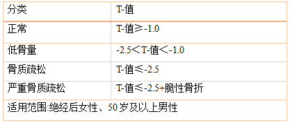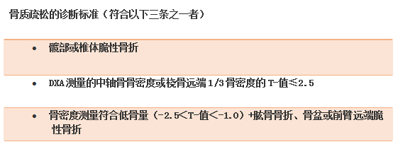DXA测量的骨密度是目前通用的骨质疏松诊断指标。基于DXA测量的中轴骨(腰椎1-4、股骨颈或全髋)骨密度或桡骨远端1/3骨密度对骨质疏松的诊断标准是T-值≤-2.5。