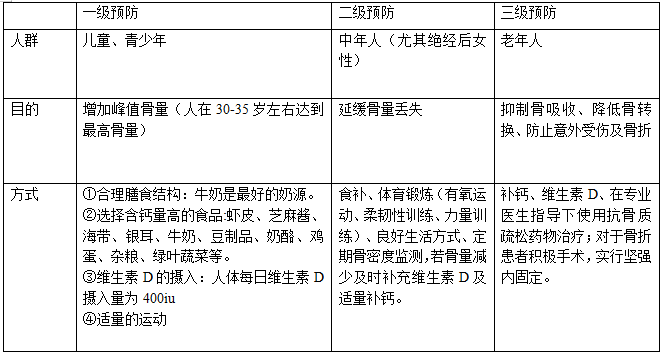 骨质疏松症重在早期预防,这比治疗更为重要。骨质疏松症给患者生活带来极大不便和痛苦,治疗收效很慢,一旦骨折又可危及生命,因此,要特别强调落实三级预防:
