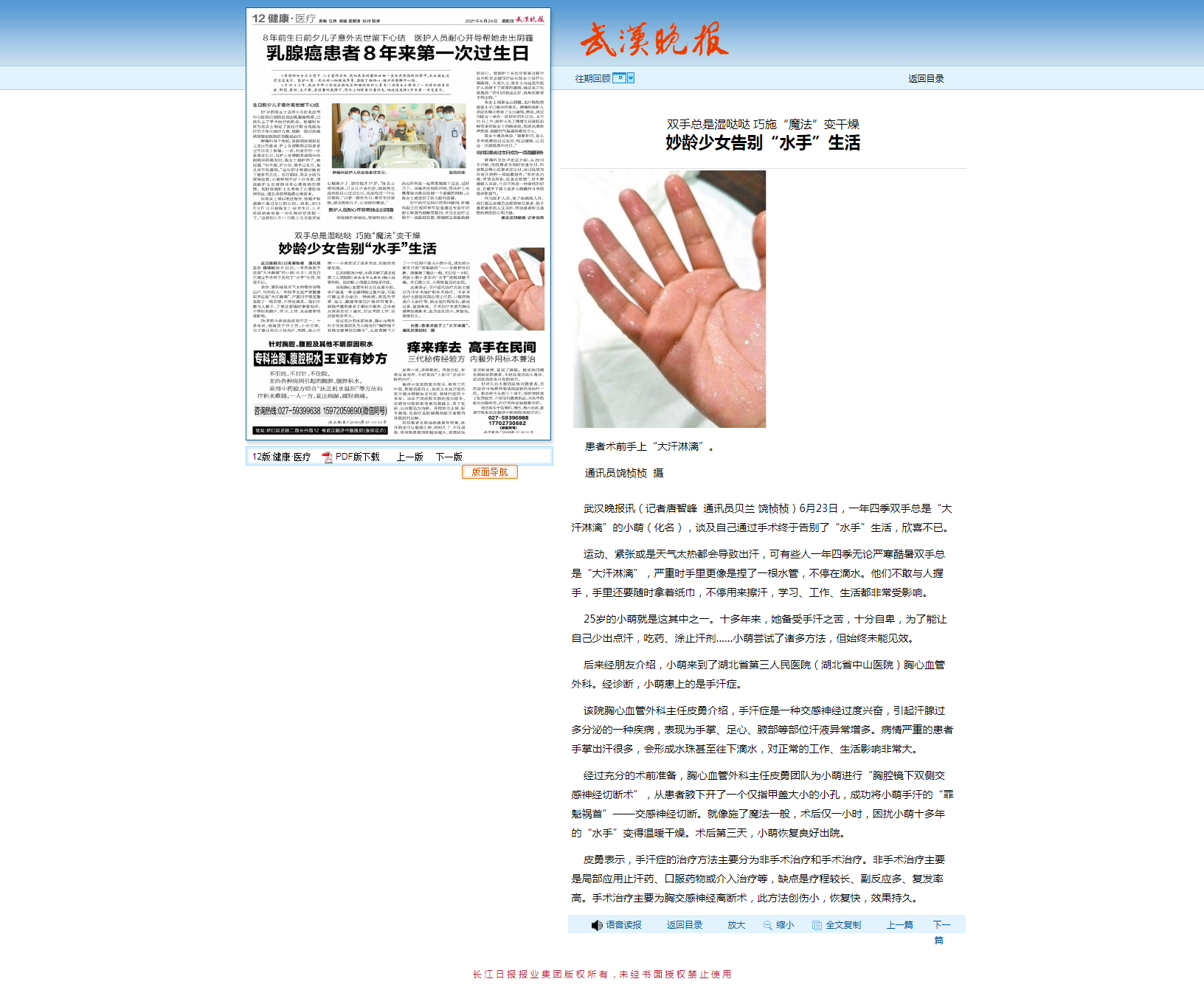 【武汉晚报】双手总是湿哒哒 巧施“魔法”变干燥 妙龄少女告别“水手”生活 发布时间:2021-06-24 来源:转载自武汉晚报 上一篇:【楚天都市报】冷门水果油柑成今春饮品界“扛把子” 专家提醒:补充维C并非越多越好,糖尿病患者切勿盲目跟风 下一篇:【楚天都市报】电锯惊魂!男子三处被割伤命悬一线 多学科团队争分夺秒抢回一命