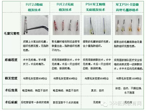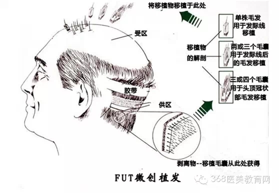 (1)、FUT------单体毛囊培植再生技术,从自身后枕部集中提取毛囊,采用专利精细器械单体移植。适合:脱发面积较大或者严重者,一次最多可取3000单位左右,术后效果会留下疤痕。