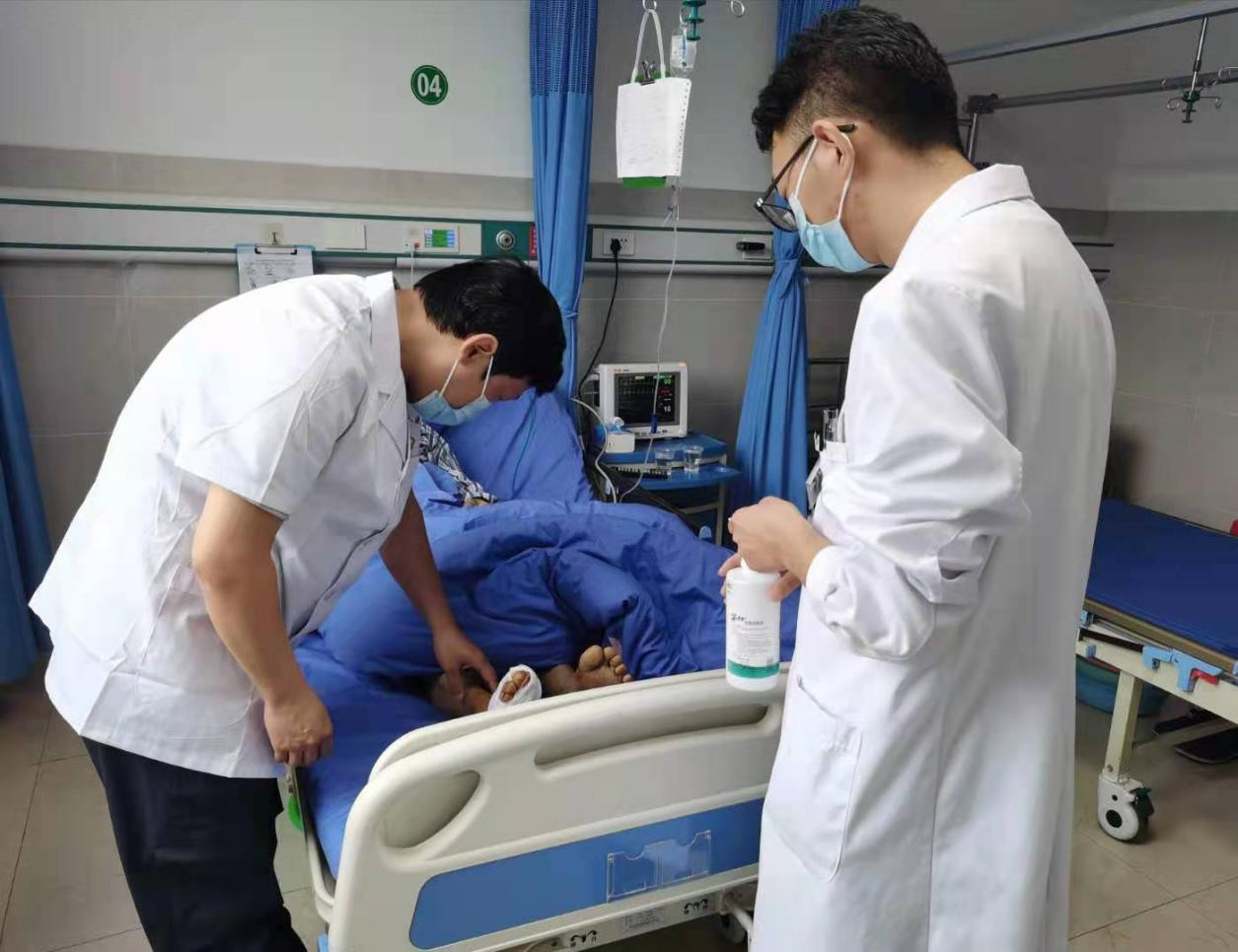 8月14日,省第三人民医院医疗救治组刘黎明、江南芳到内科病房进行查房。78岁的汪爹爹在逃生过程中被一个破盆子戳伤左下肢和左脚导致发热,被救援队紧急送到随县人民医院,查体时刘黎明发现患者左下肢有一片红肿,且左侧拇趾和足后跟都有破溃,皮温明显升高,目前体温37.9℃,提示感染非常严重。刘黎明主任向管床医生了解病人目前的辅助检查结果和用药情况并建议调整抗感染治疗方案。临走时刘黎明嘱咐汪爹爹:“您一定要安心治病,有什么不舒服、不清楚的地方随时提出来,我们都会尽力帮您解决。”