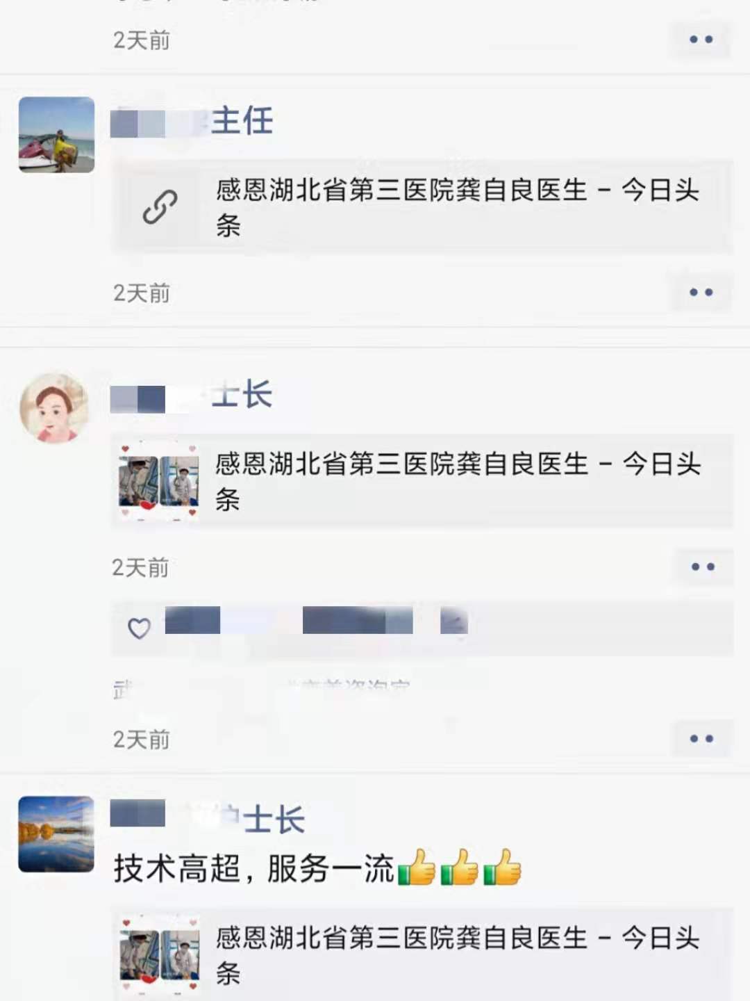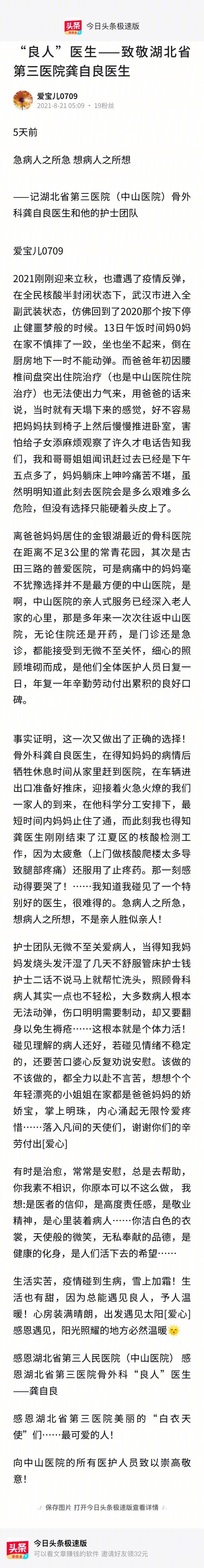 入院后龚医生迅速为患者诊断并采取相应治疗措施,及时缓解了陈婆婆的疼痛症状,看到母亲的情况稳定下来,陈婆婆的女儿悬着的心终于得以放下。“此刻我也得知龚医生刚刚结束了江夏区的核酸检测工作,因为太疲惫(上门做核酸爬楼太多导致腿部疼痛)还服用了止疼药。那一刻感动得要哭了!……我知道我碰见了一个特别好的医生……” 陈婆婆的女儿在文章中深情的写到。