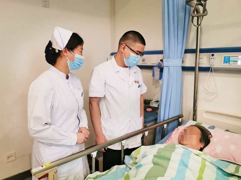 龚自良医生、钱明月护士询问陈婆婆的恢复情况