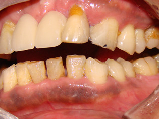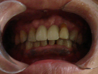 患者,黄某。男,55岁,主因上颌前牙缺失要求镶牙。临床检查:8,9缺失,10松动三度,牙周退缩。下前牙软垢及结石存在。辅助检查:10牙片显示根尖周暗影,不明透光影。诊断:肯氏四类牙列缺损;牙周炎;10根尖周炎。处理:10一次性根管治疗,上下牙周洁治。2天后上颌6,7,10,11备牙取模。7天后修复体试戴,粘固。患者满意。治疗时间10天,就诊三次。