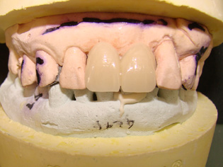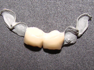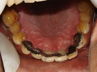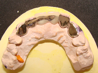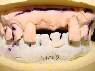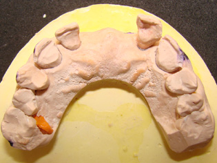 如何处理10,11牙相邻间隙;6,7相邻间隙的问题。6,7牙的间隙在1mm以内,因为不妨碍义齿制作可以后期处理;10,11牙有1.5-2mm的间隙,若在金属备板前方上瓷做一个小牙,很难看,排除这个策略。因此先用光固化树脂将间隙封闭是最佳选择。先取上下合模型,观察上下牙咬合接触区,对备牙厚度做一指导。在石膏模型上用蜡恢复牙间隙接触关系,修整蜡型,特别是舌侧要求邻面做成备牙后的形状,硅橡胶初印模在10,11石膏牙的舌侧压出阴模,备用。将此阴模放在10,11天然牙的舌侧,以此为模板将间隙封闭。6,7牙间隙很小,后期在背板上用光固化修复即可,先修复会影响取模和金属背板的制作。10,11牙间隙封闭后,二次硅橡胶印模很难取下,最后是10,11牙的关固化材料的最薄弱处出现折裂,10牙重新松动才取下。不过这也不要紧,即使光固化全部脱落,也可等金属背板完成后以金属背板为模板再修复,硅橡胶背板变成了金属又有什么不可呢?先期进行光固化治疗的目的是为了方便金属背板的制作。
