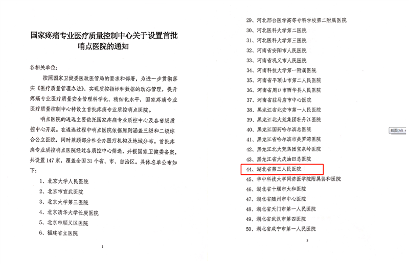 我院是集医疗、教学、科研、保健为一体的省级三级甲等医院,也是湖北省疼痛科医疗质量控制中心挂靠单位。在省卫生健康委的直接领导下,湖北省目前已建立疼痛质控省市二级质控网络。在国家级疼痛质控中心的指导下,我院作为湖北省疼痛科质控中心挂靠单位及首批国家疼痛质控哨点医院,将继续发挥学科优势,进一步完善湖北省疼痛学科的质量控制体系和建设,全方位构建疼痛质控三级网络,加强单病种质控及疼痛常见疾病诊疗的临床路径探索,让患者享受到同质的疼痛诊疗服务。(文:王云霞)