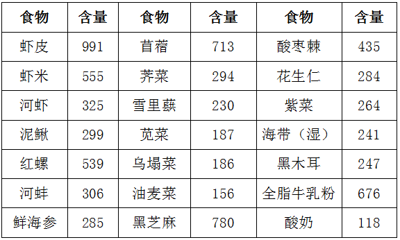 含钙丰富的食物(单位:mg/100g)