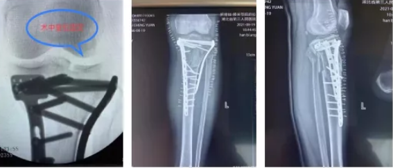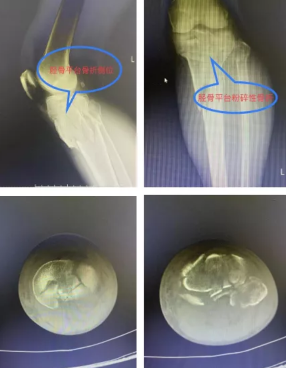 到达医院后,关节创伤骨科值班医生袁文泽和主治医师刘超迅速接诊,在查看伤情后随即安排检查,X光结果提示:左膝胫骨平台内外后三个方向塌陷骨折,需要手术治疗。经过一个星期的跟骨牵引、消肿、止痛抗凝等治疗,吴师傅伤情稳定,10月18日,关节创伤骨科主任王显勋根据伤者具体情况,选择为其进行内外后三个方向钢板固定术,通过胫骨平台内外侧两块钢板巧妙恢复胫骨平台关节面的平整,同时将骨折固定牢靠,两个小时后吴师傅被顺利推出手术室。