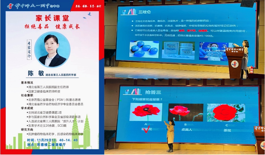 为了让学生认识毒品的危害,增强青少年识毒、防毒、拒毒意识,关爱青少年身心健康,2021年11月29日,湖北省第三人民医院(湖北省中山医院)药学部主任张明伟带领科内药师在华师一附中初中部开展“拒绝毒品,健康成长-药学科普进校园活动”,该校约600余名师生通过线上及线下参加此次活动。