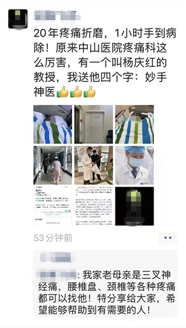 “20年疼痛折磨,1h手到病除!原来中山医院疼痛科这么厉害,有一个叫杨庆红的教授,我送他四个字:妙手神医!”,这是患者李婆婆的女儿王女士在母亲出手术室后第一时间发的朋友圈,不用问,看来湖北省第三人民医院(湖北省中山医院)疼痛科二病区主任杨庆红又圈了一波粉。