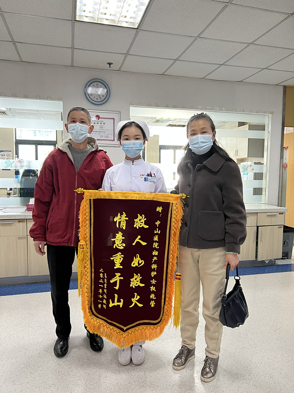 12月7日上午,吴女士及家人来到湖北省第三人民医院(湖北省中山医院)妇产科,把一面写有“救人如救火 情意重于山”的锦旗送到权兆莹护士手上,对权护士救助自己的母亲表示深深的感谢。