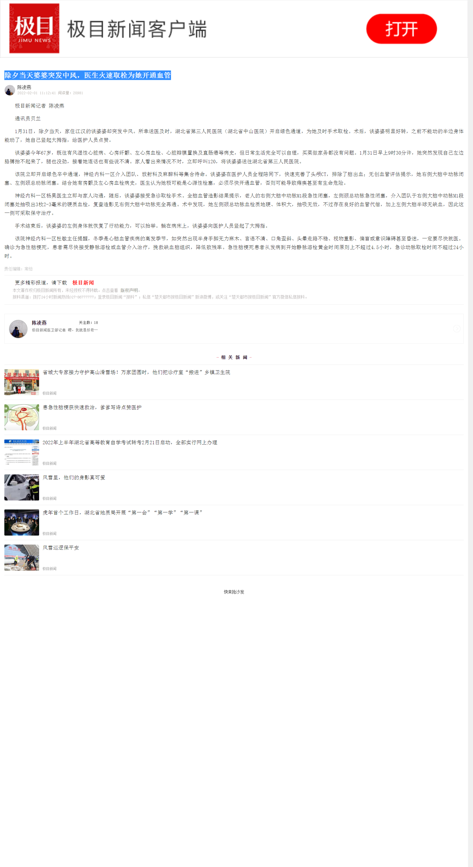 【楚天都市报】除夕当天婆婆突发中风,医生火速取栓为她开通血管 发布时间:2022-02-09 来源:楚天都市报 上一篇:【楚天都市报】七旬太婆半边脸“闪电疼”,医生用一根细针“针到病除” 下一篇:【楚天都市报】去海南过冬突发心梗,八旬老人紧急转运回汉获救