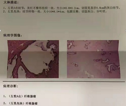 入院第三天,甲乳外科主任戚鹏为小雪行全麻下左乳腺体区段切除术,完整切除一大一小两个肿瘤,并且幸运的是,术后小雪的病检结果是纤维腺瘤,为良性肿瘤。
