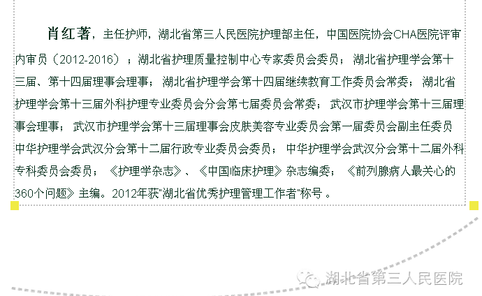 湖北省第三人民医院是湖北省卫生计生委直管的三级甲等综合医院。医院现有护理人员522人,其中副主任护师27名,主管护师124名,护师126名,护士245名;大专及以上学历护士占全院护士总数85%以上。