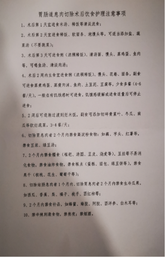 经过医护们的精心治疗和护理,舒爹爹恢复良好,可以出院回家了。在舒爹爹出院这天,他的责任护士贴心的为其进行了胃肠息肉术后的饮食健康宣教,并且把相关的注意事项打印了出来,方便舒爹爹随时查看。