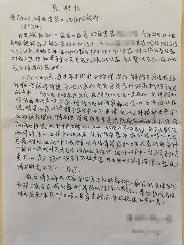 “入院以来,目睹了疼痛科医生护士的工作状态,对工作的责任感,对病人热情、和蔼可亲的态度,令人赞叹不已,在此我表示深深的感谢。”近日,湖北省第三人民医院(湖北省中山医院)疼痛二科收到了一封感谢信,这是88岁的患者黄婆婆亲笔所写,目的就是为了感激疼痛二科医护治好了自己多年的疾病。
