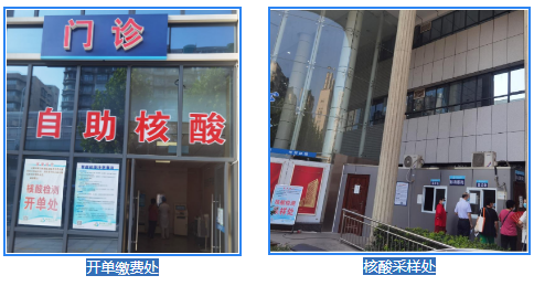 门诊入口外“自助核酸”处使用身份证可在自助机上开具核酸检测,实现开单、缴费一站式服务。缴费成功后,凭缴费单至采样处采样。2022年7月29日医院新系统上线后使用身份证认证过的医保卡、健康码、电子健康卡亦可在此处自助机上开核酸检测。