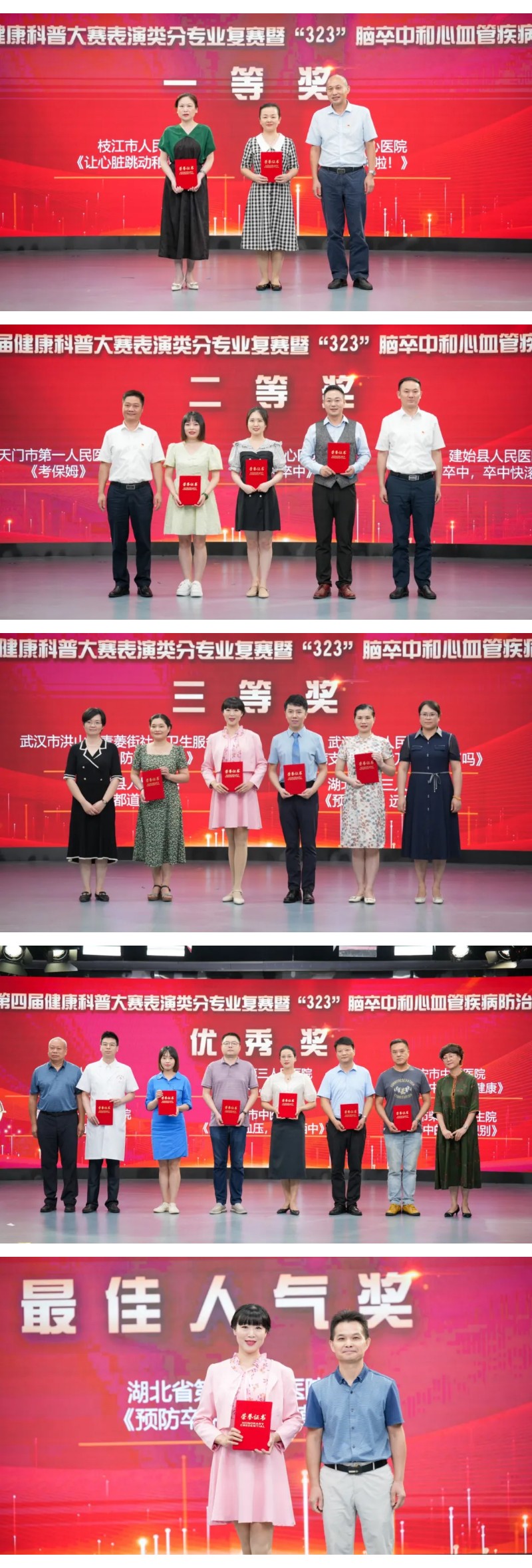比赛中,15组参赛队伍或用身边的案例科普中风的征兆,或生动形象地讲解各类心血管疾病的危害,或通过现场演绎传授如何预防并治疗脑卒中和心血管疾病。经过激烈角逐,来自枝江市人民医院的作品《让心脏跳动和谐音符》和荆州市中心医院的作品《丞相中风啦!》获得一等奖,来自天门市第一人民医院的作品《考保姆》、襄阳市中心医院的作品《卒中 卒中》和建始县人民医院的作品《卒中,卒中快滚蛋》获得二等奖,来自武汉市洪山区青菱街社区卫生服务中心的作品《脑卒中防治三句半》、省人民医院的作品《冠心病支架术后就万事大吉了吗》、蕲春县人民医院的作品《艾都道卒中》和省第三人民医院的作品《预防卒中 远离烟草》获得三等奖。来自咸丰县人民医院、省第三人民医院、咸宁市中医医院、襄阳市第一人民医院、鄂州市中医医院、钟祥市柴湖镇卫生院等医疗机构的6组参赛作品获得优秀奖。另外,通过网络展示及投票程序,好评票数最高的省第三人民医院作品《预防卒中 远离烟草》获得本次比赛的最佳人气奖。