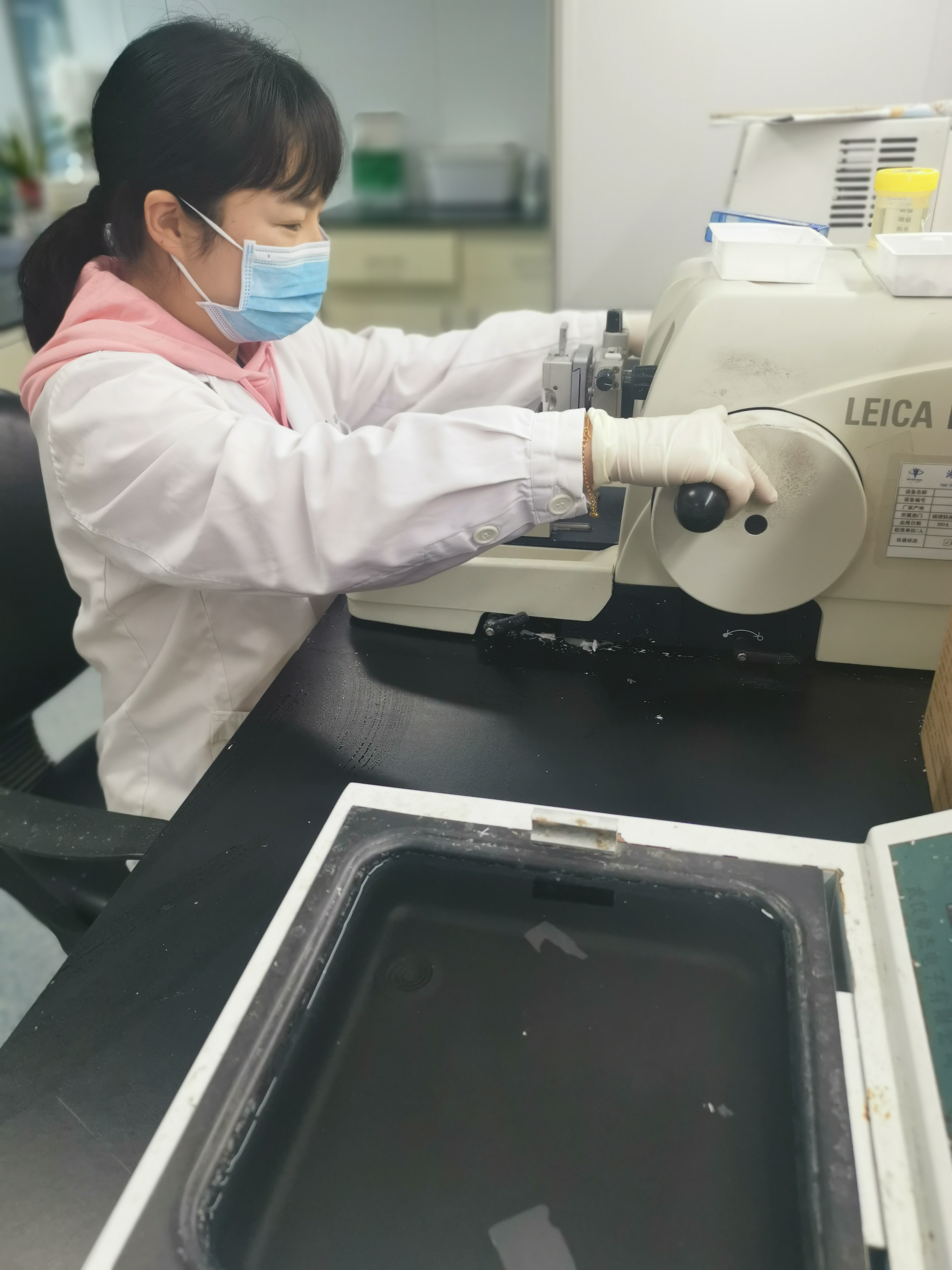 如果要做术中冰冻快速切片,手术离体标本不能固定,要马上送到病理科,放入冷冻机里冻成硬块,制成切片后快速诊断。从病理医师接收取材,到病理技师切片、染色到送交病理医师诊断出结果,整个过程仅仅只需要半小时。