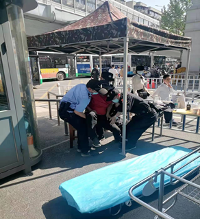 2022年4月9日上午,医院北大门执勤的保卫人员张皓正对入院人员检查健康码和行程码,这时一位穿红色上衣的男子走到张皓身旁说:“我快不行了。”只见该男子面色苍白,身体无力快倾斜倒地。张皓立即扶起该男子,并呼喊班长周磊一同搀扶男子到岗亭旁坐下。另一名保卫人员刘世强则前往急诊科通知医护人员,并推来一辆平板车。正在巡逻的安保人员恽坚看见后也上前帮忙,四名保卫人员齐心协力将快休克的男子抬到平板车上,与迅速赶来的2名医护人员一同将男子送到急诊科进行救治,为患者争取到了宝贵的急救时间。