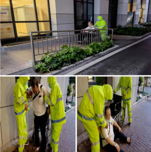 无独有偶,4月13日上午6点,一名急诊的患者一不小心摔坐在地上。值班保卫人员黄启明见状忙上前查看,由于摔得较重,该患者不能自行站立。黄启明通知同事付雪舟推来轮椅,一同将患者扶上轮椅,并将其送往急诊外科就诊。