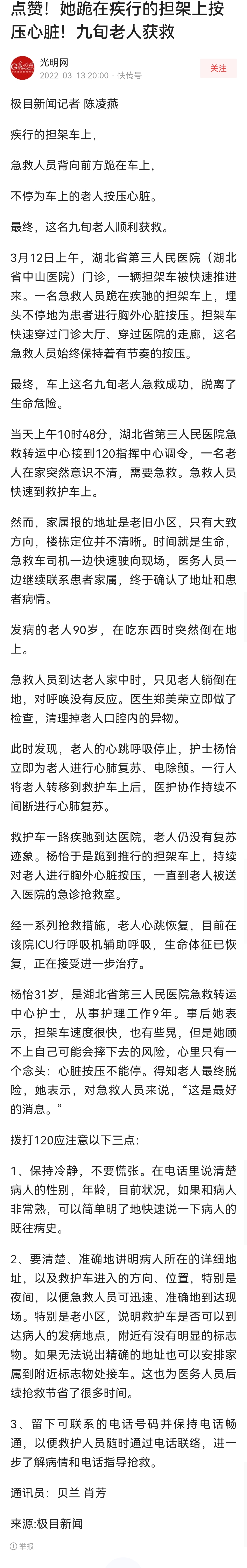 【光明网】点赞!她跪在疾行的担架上按压心脏!九旬老人获救 发布时间:2022-03-13 来源:光明网 上一篇:【长江云】绿色通道抢救急性脑梗死患者 爹爹写诗盛赞悬壶济世杏林功 下一篇:【荆楚网】神奇“臭氧袋”治好婆婆的烂脚跟
