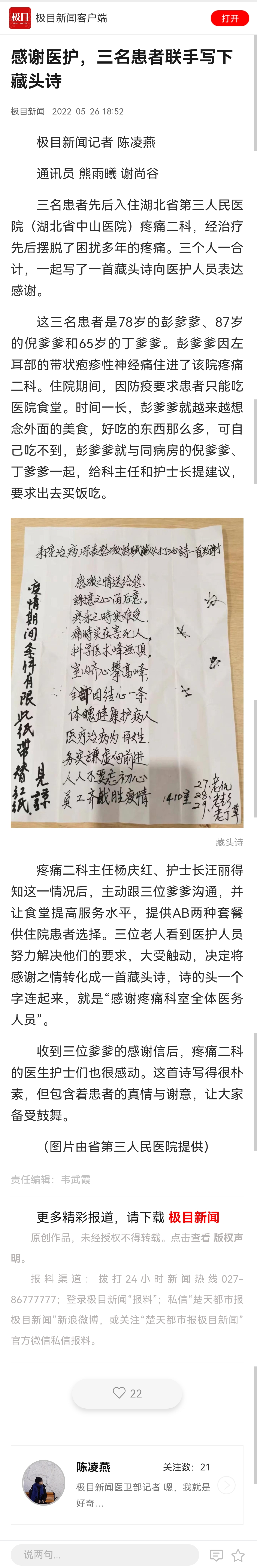 【极目新闻】感谢医护,三名患者联手写下藏头诗 发布时间:2022-05-26 来源:极目新闻 上一篇:【极目新闻】“鄂”来守“沪”小学生写下一首小诗送给大白阿姨 下一篇:【极目新闻】痛风石把脚撑变形,4个月治疗“缩石”成功
