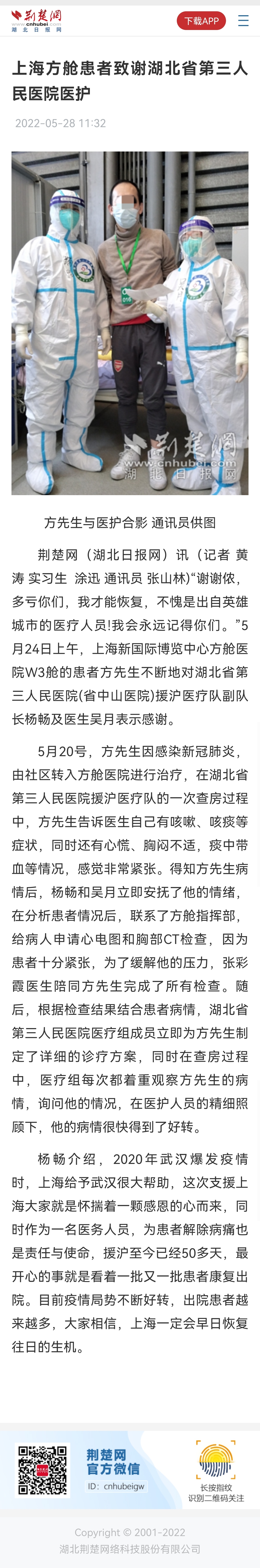 【荆楚网】上海方舱患者致谢湖北省第三人民医院医护 发布时间:2022-05-28 来源:荆楚网 上一篇:【极目新闻】“鄂”来守“沪”她是医疗队“最唠叨的人”,也是最贴心的“小卫士” 下一篇:【长江日报】78岁老人肚子上长出个“百香果”,医生清理出200多颗胆囊结石