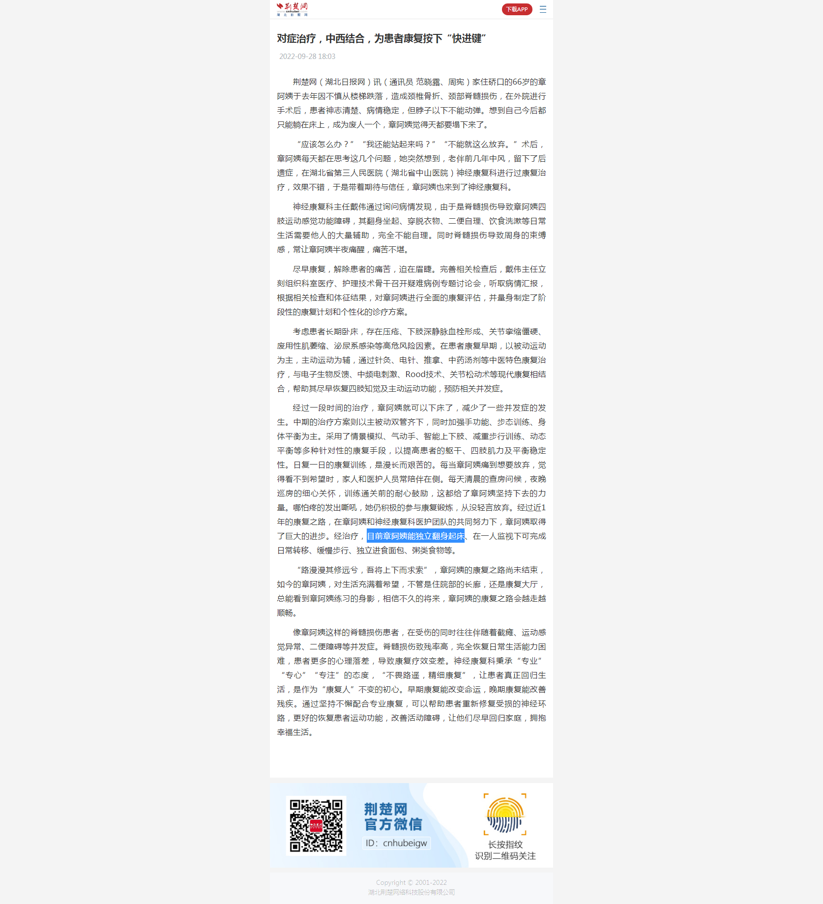 【荆楚网】对症治疗,中西结合,为患者康复按下“快进键” 发布时间:2022-09-28 来源:荆楚网 上一篇:【长江日报】旬男子打球后突发心梗,1小时排“堵”抢回一条命 下一篇:【荆楚网】“拆弹”专家化险为夷 脑动脉瘤破裂患者跨过“生死关”