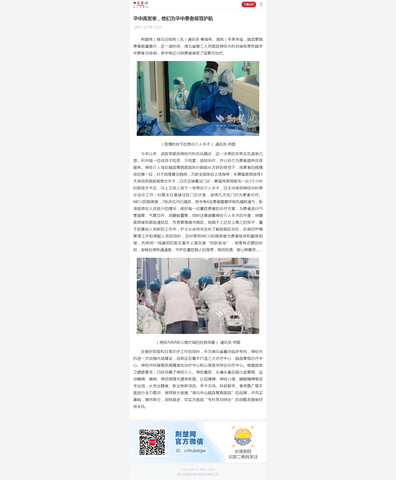 【荆楚网】卒中高发季,他们为卒中患者报价护航 发布时间:2022-12-28 来源:荆楚网 上一篇:【楚天都市报】丹麦球星戴心脏除颤器打世界杯,专家:不建议普通患者剧烈运动 下一篇:【央广网】“轻伤不下火线”她们携手共迎花开时节