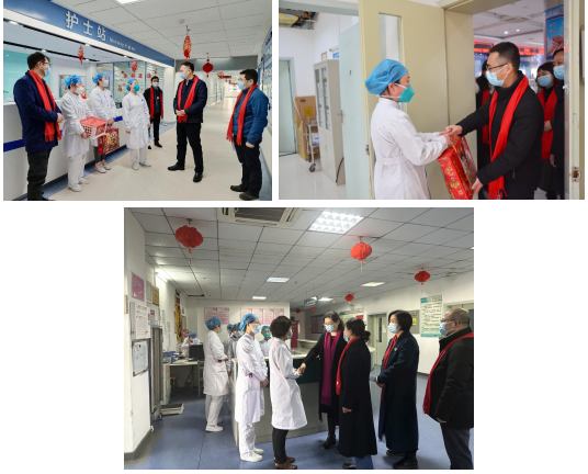 “新年好”“提前给大家拜年了”“大家辛苦了”,魏院长一行深入门诊、医技及各临床科室向坚守一线的工作人员拜年。每到一处,院领导详细询问各科室的运行情况及春节值班安排,叮嘱大家春节期间要树牢安全意识,注意用电用水安全和医疗安全,做好节日期间的医疗救治保障工作,让住院患者度过一个平安、祥和、欢乐的春节。院领导们向大家致以新春的祝福,祝大家身体健康、阖家幸福、万事如意,并送上新春慰问品。
