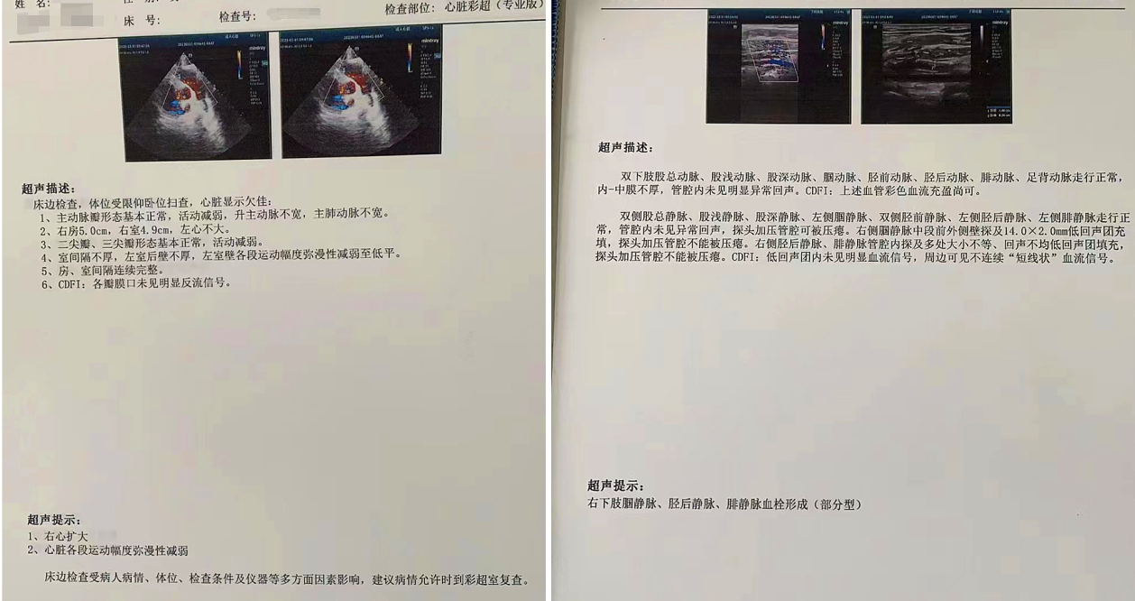 当天9点25分,小杨被送至急诊科,此时他面色苍白、呼吸困难、烦躁不安,无法配合治疗。急诊科医护紧急给予对症治疗,同时联系重症医学科(ICU)、心血管内科、超声影像科专家会诊。9点35分,小杨突然丧失意识,双侧瞳孔散大、心跳呼吸暂停,急诊科联合ICU医生立即行胸外心脏按压,呼吸球囊辅助呼吸,气管插管等抢救措施,因病情尚未明确,ICU医师紧急联系超声科医生行床旁心脏超声,心脏各切面均可见右心急性扩张,胸骨旁短轴切面可见左心室明显“D字征”,根据病人临床表现及超声检查,高度可疑为“急性大面积肺栓塞”,追问患者朋友,进一步了解到患者近日有下肢疼痛感,且既往有下肢骨折史,进而超声发现患者右下肢多处血栓形成。明确诊断后,阳逻院区院长、心血管内科学科带头人杨波当机立断给予阿替普酶治疗,为患者紧急溶栓。持续近一个小时的心肺复苏和溶栓治疗将小杨从死神手里拉了回来,10点14分,小杨心跳、呼吸恢复。