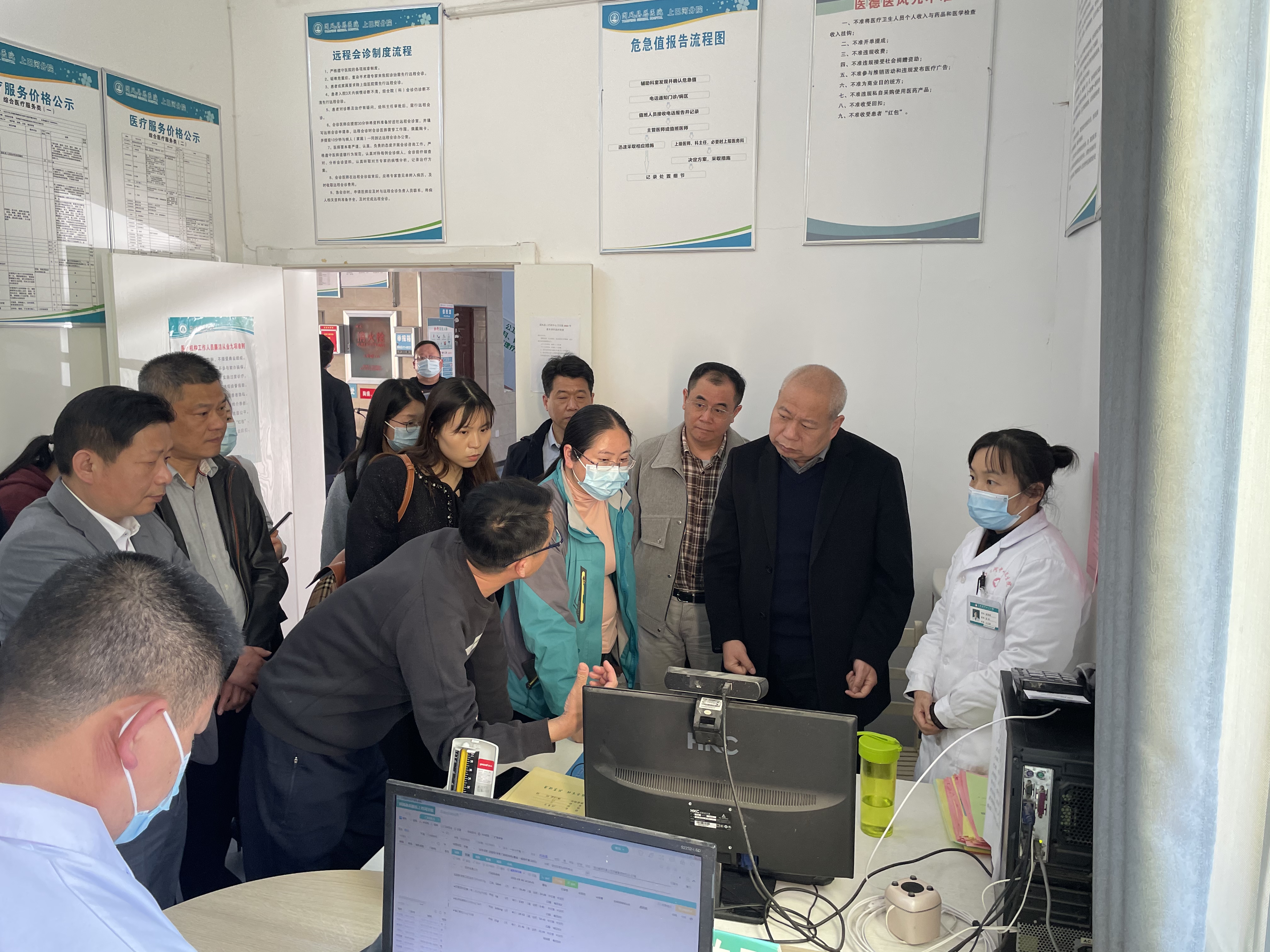 在团风县上巴河中心卫生院公共卫生科,彭小祥院长和武汉大学全球健康中心主任、省“323”攻坚行动副组长毛宗福查看了团风县公共卫生管理系统,详细了解脑卒中筛查、居民健康档案建立以及县、乡、村上下联动的情况,并提出要加强专业督导,实现脑卒中筛查与防治的闭环管理。随后,彭小祥一行又来到急诊抢救室,了解卒中抢救设备,询问卒中抢救流程,查看卒中抢救记录,分析卒中溶栓病例,解读心脑血管一体化防治站建设标准,同时对当地医务人员进行卒中早期识别的现场指导。