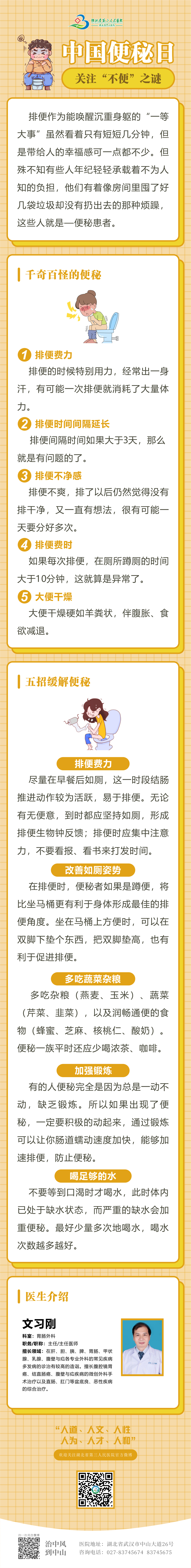【中国便秘日】关注“不便”之谜 发布时间:2023-03-31 来源:胃肠外科 上一篇:你了解什么是孤独症吗? 下一篇:守护健康,情满交投——健康管理(体检)科赴湖北交投襄阳运营公司开展职工健康体检工作