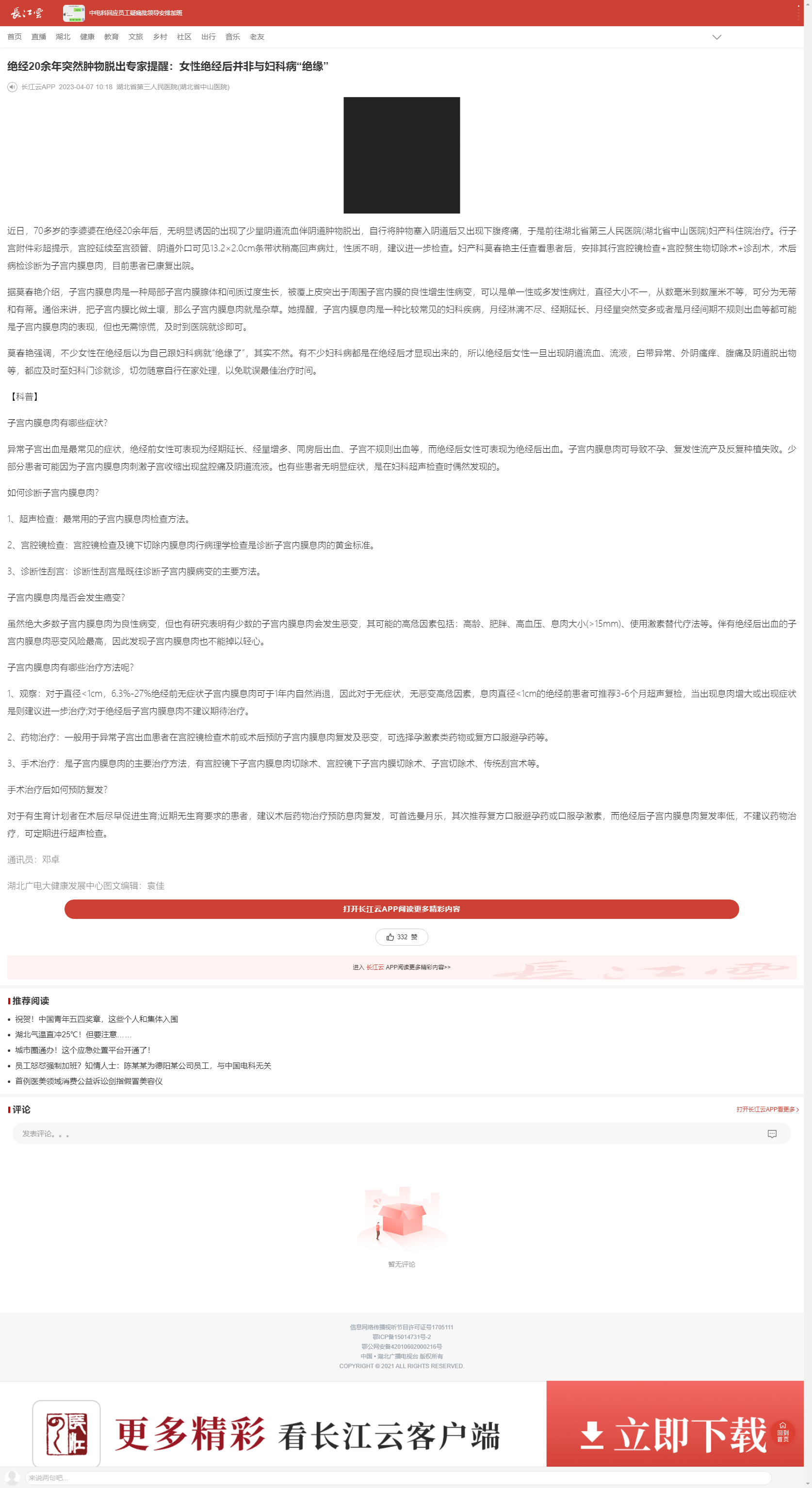 【长江云】绝经20余年突然肿物脱出专家提醒:女性绝经后并非与妇科病“绝缘” 发布时间:2023-04-10 来源:长江云 上一篇:【荆楚网】51岁男子支架植入后5天突发急性心肌梗死,医生:这四点一定要牢记 下一篇:【长江日报】手术8天后左腿比右腿粗了一圈,原来是深部静脉血栓所致