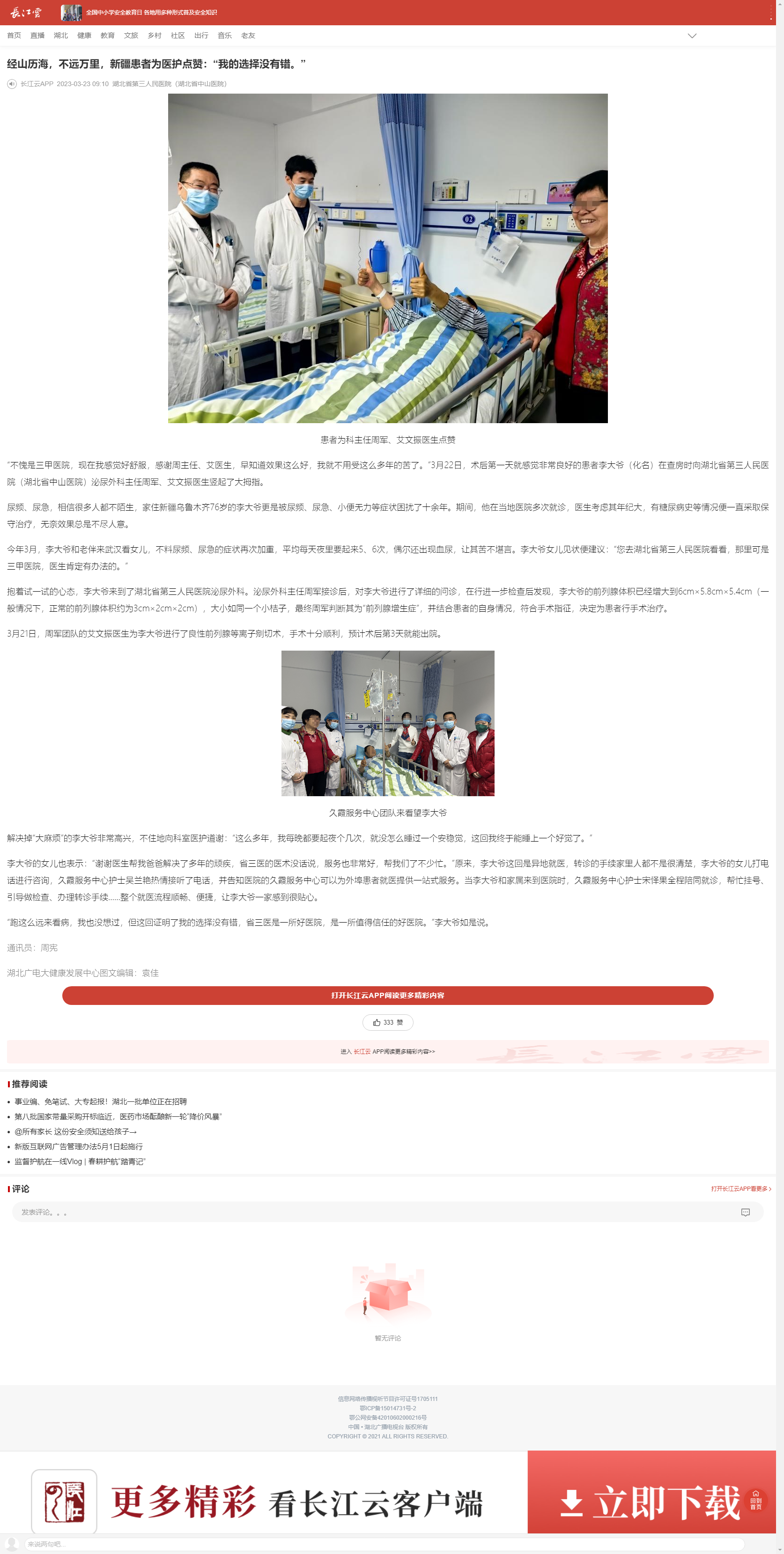 【长江云】经山历海,不远万里,新疆患者为医护点赞:“我的选择没有错。” 发布时间:2023-05-04 来源:长江云 上一篇:【长江日报】7年间两次同样手术体验大不同,患者直呼“舒服多了” 下一篇:【湖北日报】省三医院肾病内科党支部开展爱心访视暨主题党日活动